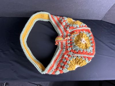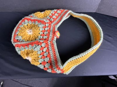 Soft fall colors with large granny squares crocheted into a fun sling bag. 12x7”