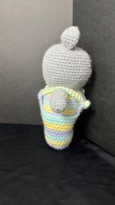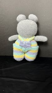 Hand crocheted amigurumi bear. Gray body with multicolored outfit. 10” tall.