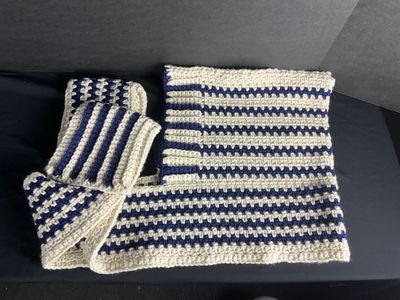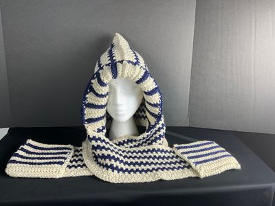 0 savesBlue and white crochet hood. Attached pockets for your phone or keys, etc.