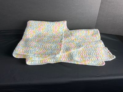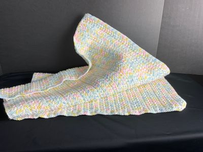 Hand crafted crochet baby blanket, 26x20”. Made with baby weight acrylic yarn. Pale pink, blue, yellow, white, green.