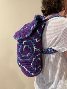 Crocheted with mosaic swirls in shades of purple and blue. 16x19. Drawstring closure